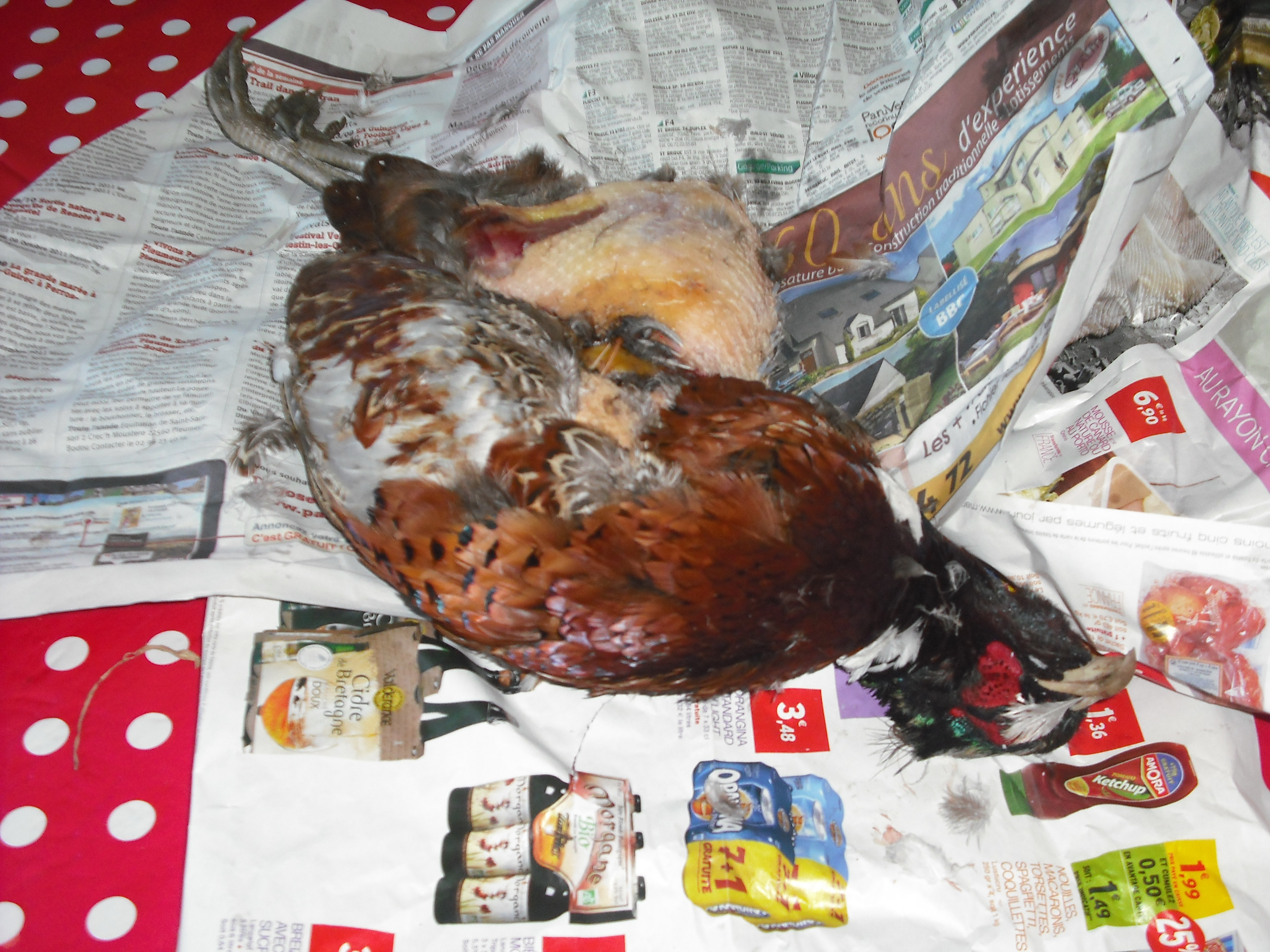 The dad of one of the girls in Jean-Baptiste’s class goes hunting. The hunting season opened on Sunday, and on Tuesday, his wife brought us a pigeon and a pheasant (their children don’t like game, so they tend to give away everything he catches). She cleaned and plucked the pigeon for Esther and left us with the pheasant to prepare. I was in a Bible study when she came. We feel very privileged to have received this gift.